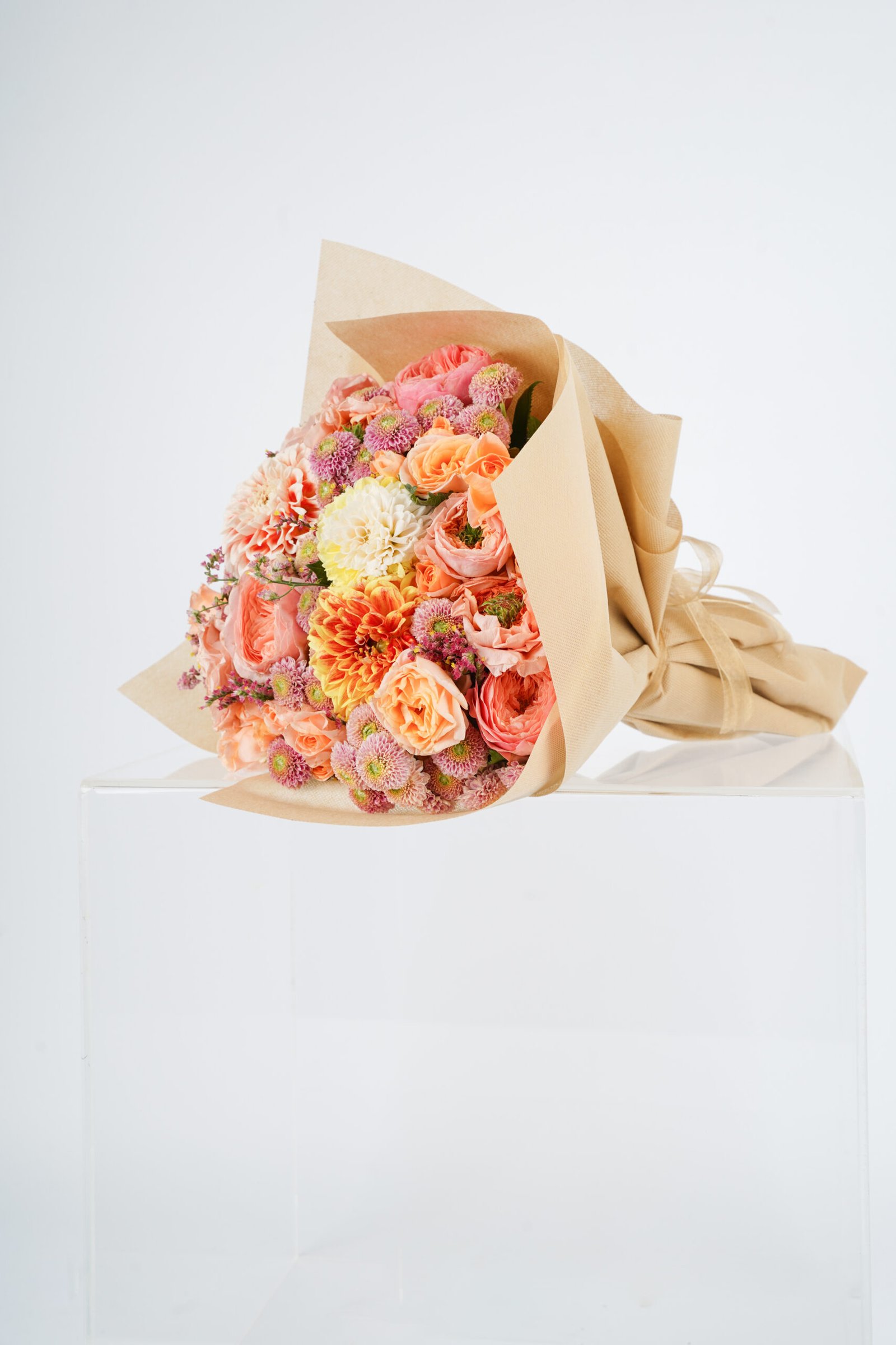 باقة يد فاخرة بألوان الخوخي الناعم والوردي، تتميز بورد الجوري الفاخر، والداليا، وزهور موسمية رقيقة.