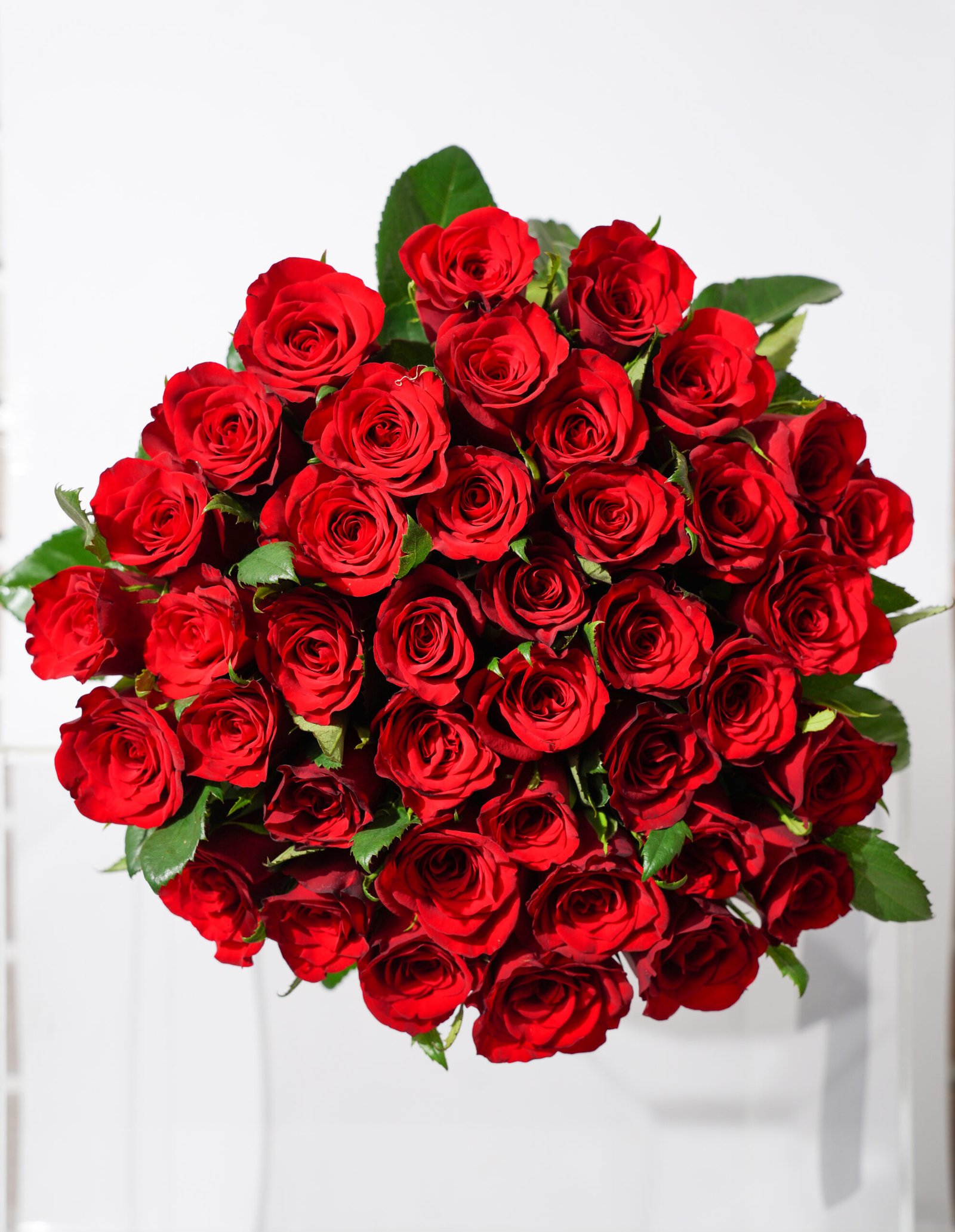 باقة كلاسيكية من ورود حمراء طازجة، ملفوفة بأناقة في خيش طبيعي ومزينة بشريط متناسق – خالدة، جريئة، ومثالية للتعبير عن الحب والشغف.