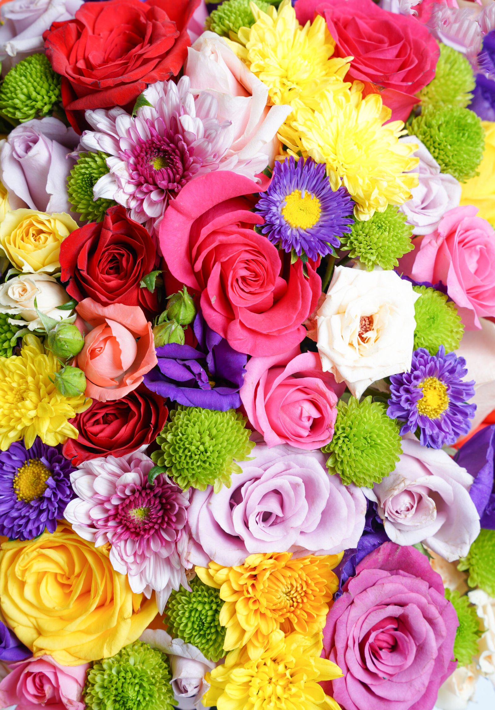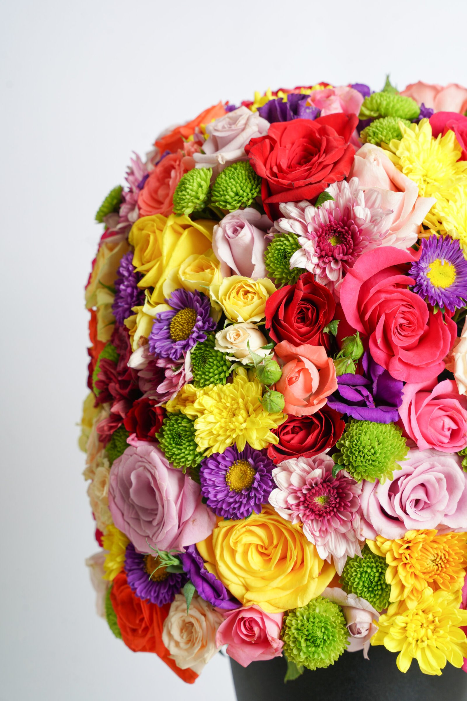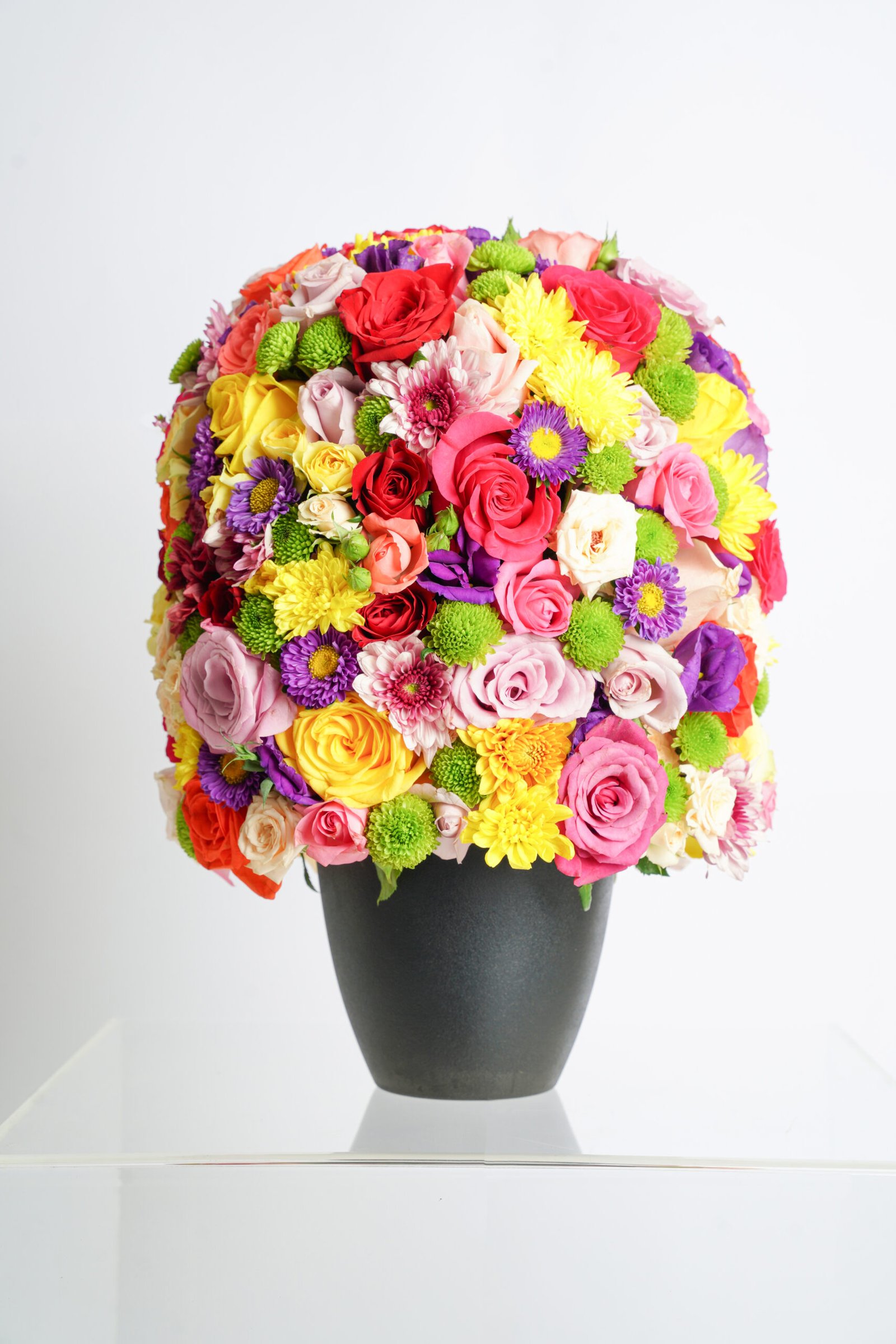 A bold dome arrangement of mixed roses, spray chrysanthemums, and seasonal blooms in vibrant colors, designed for joyful celebrations