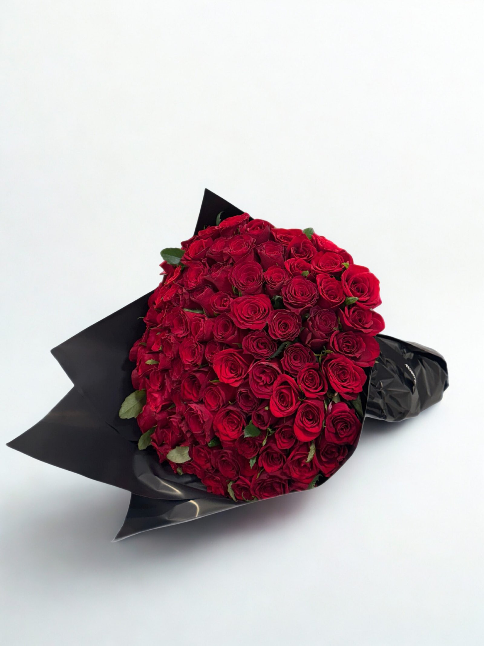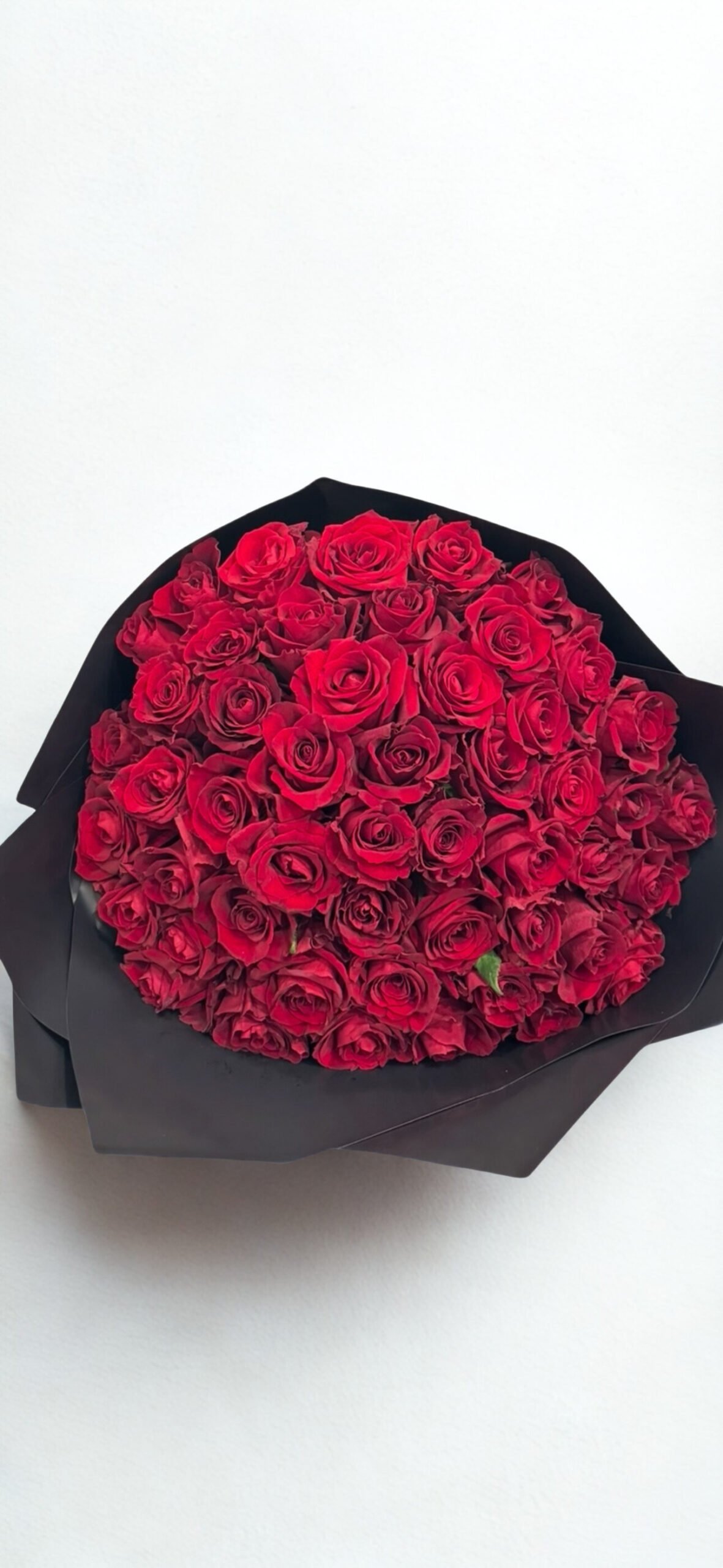 A classic bouquet of 70 fresh red roses, elegantly wrapped in natural burlap and finished with a matching ribbon—timeless, bold, and perfect for expressing love and passion