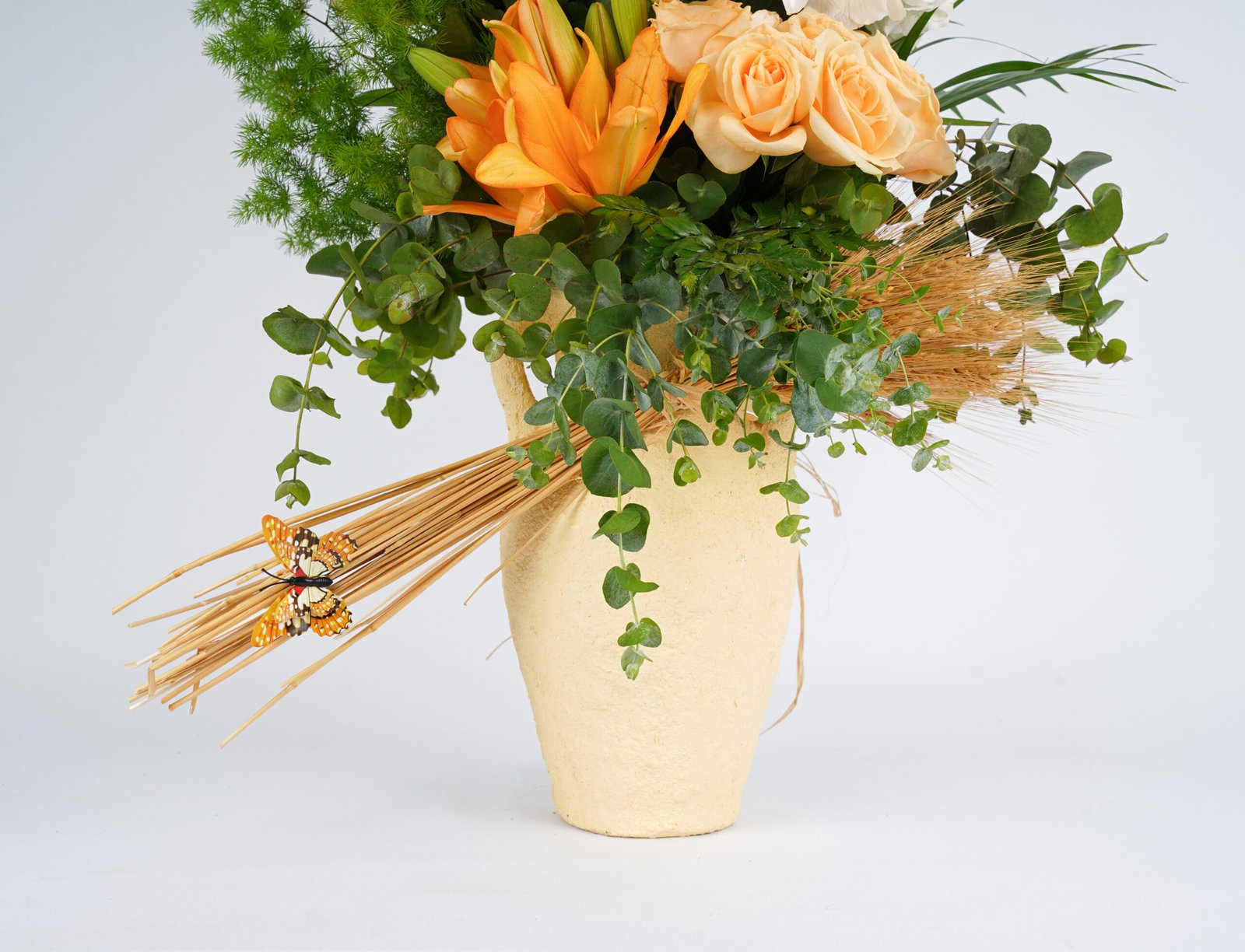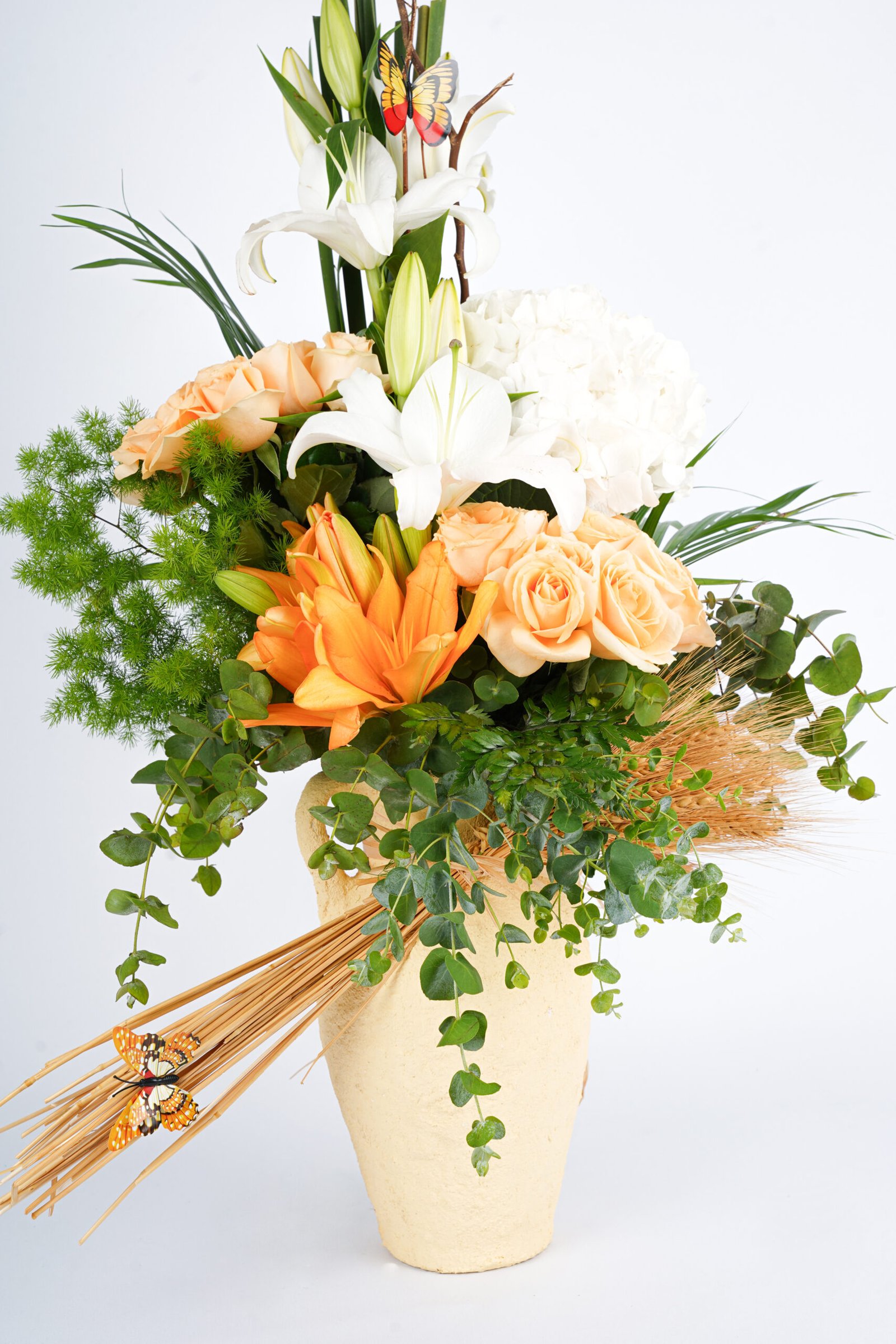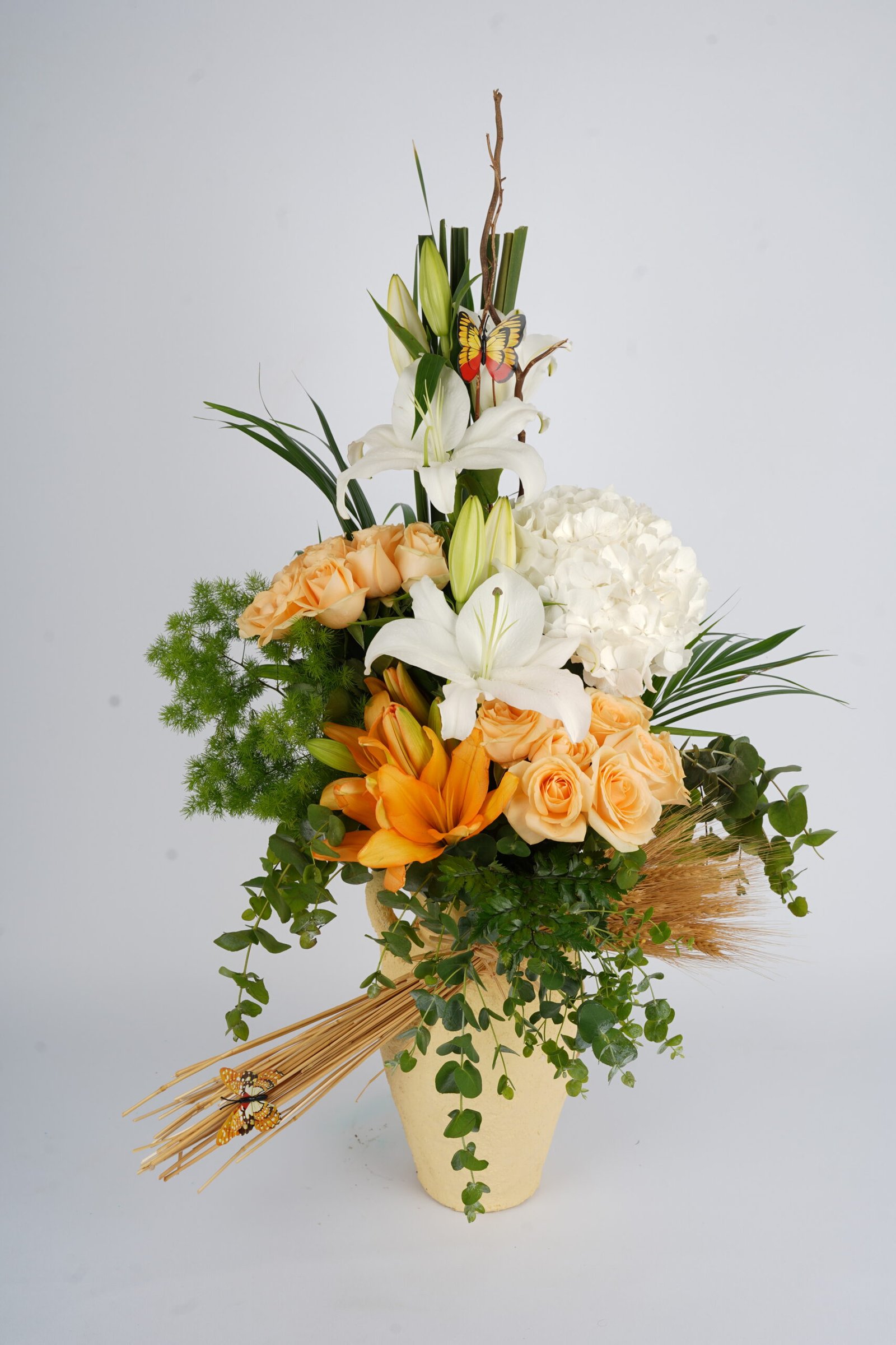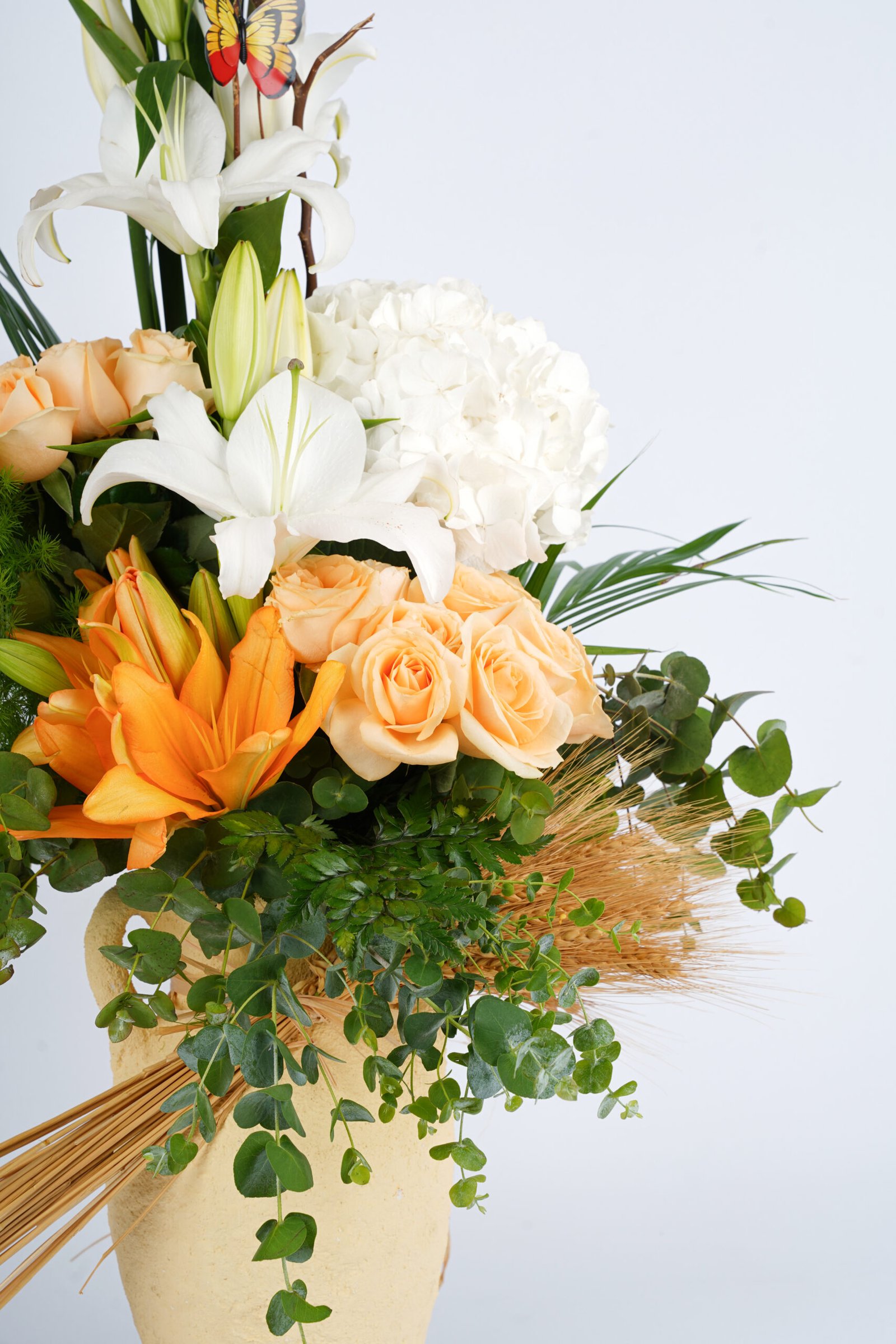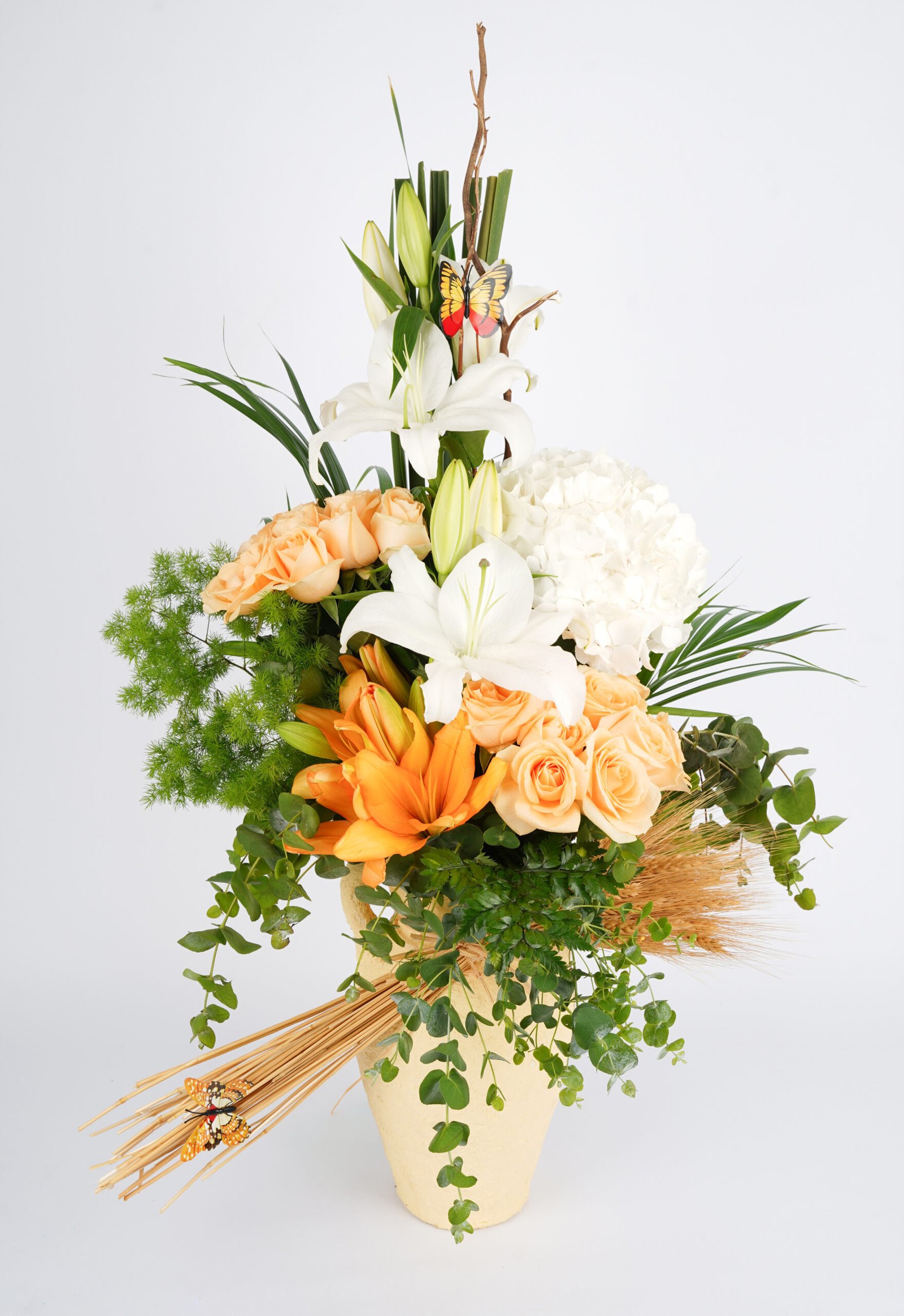 A graceful arrangement blending white lilies, hydrangea, and soft peach roses with vibrant orange blooms and lush greenery. Accented with natural wheat and delicate butterflies, this design brings warmth, elegance, and a touch of rustic charm