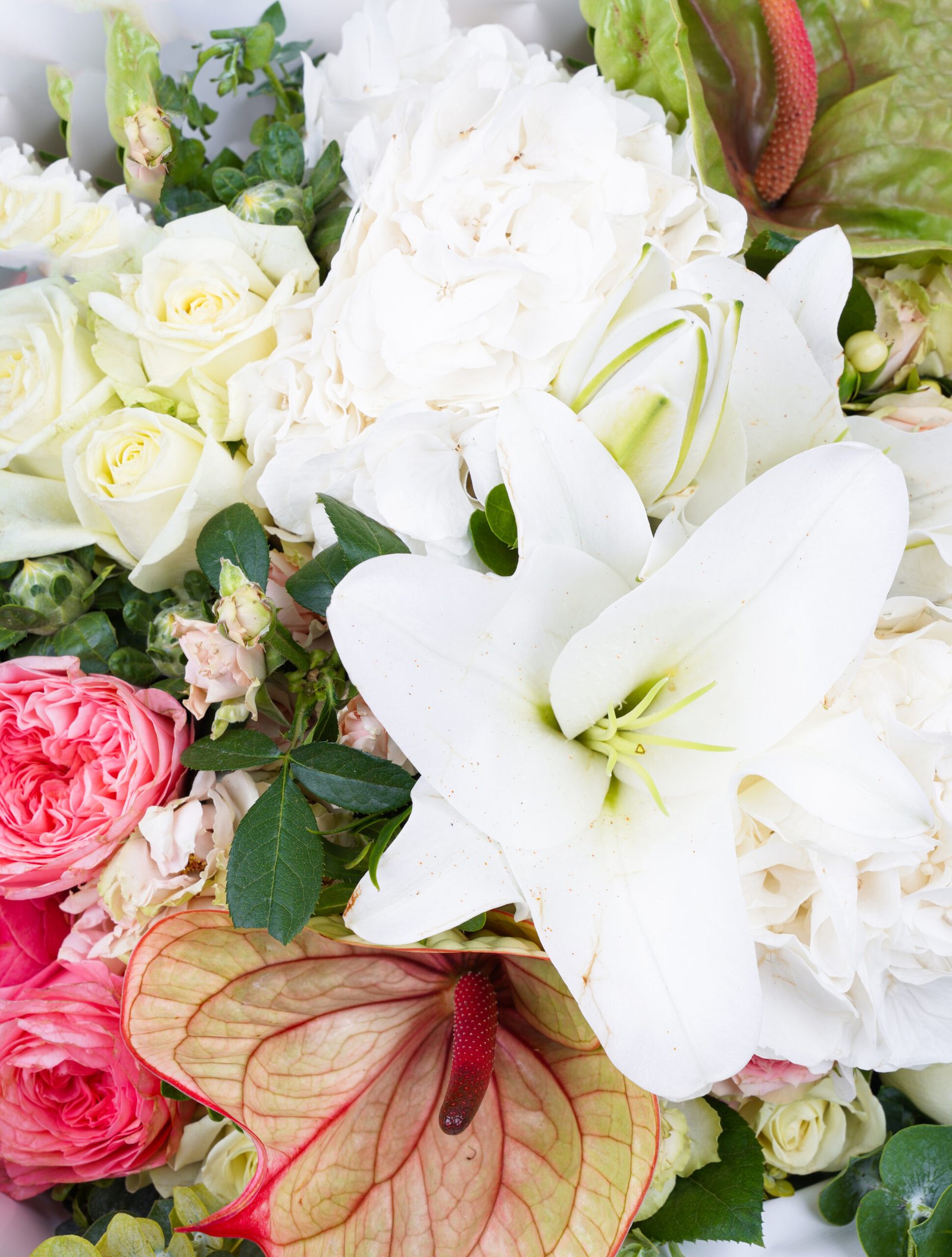 An elegant arrangement featuring white hydrangeas, white lilies, cream roses, peach garden roses, and soft anthuriums, accented with fresh eucalyptus greenery