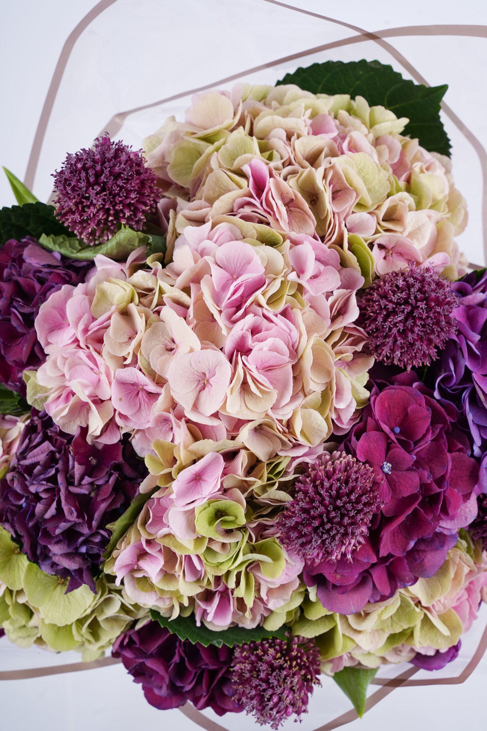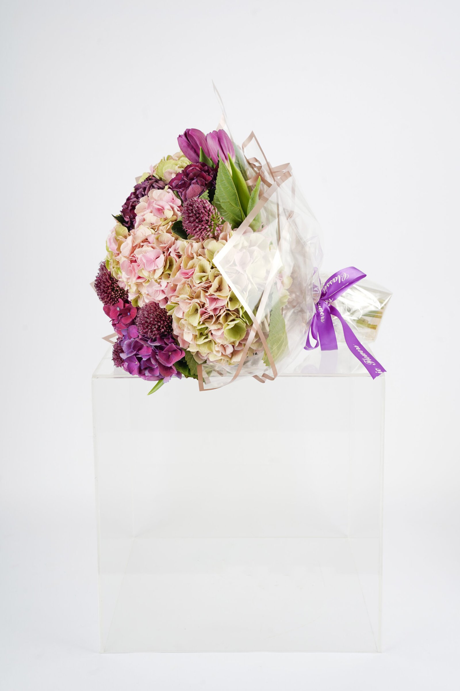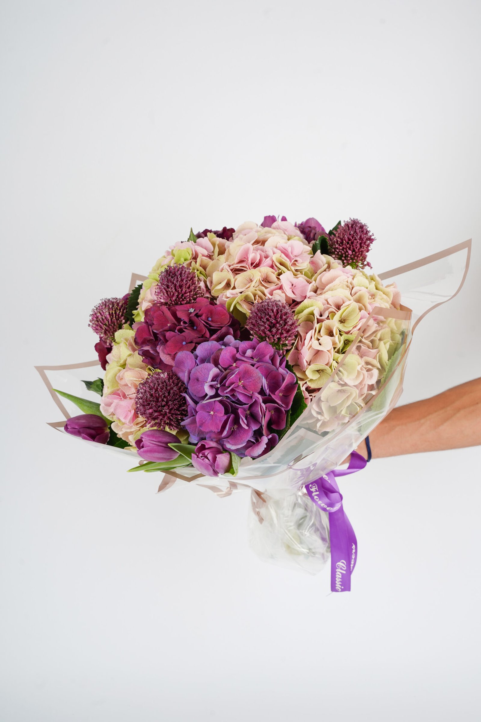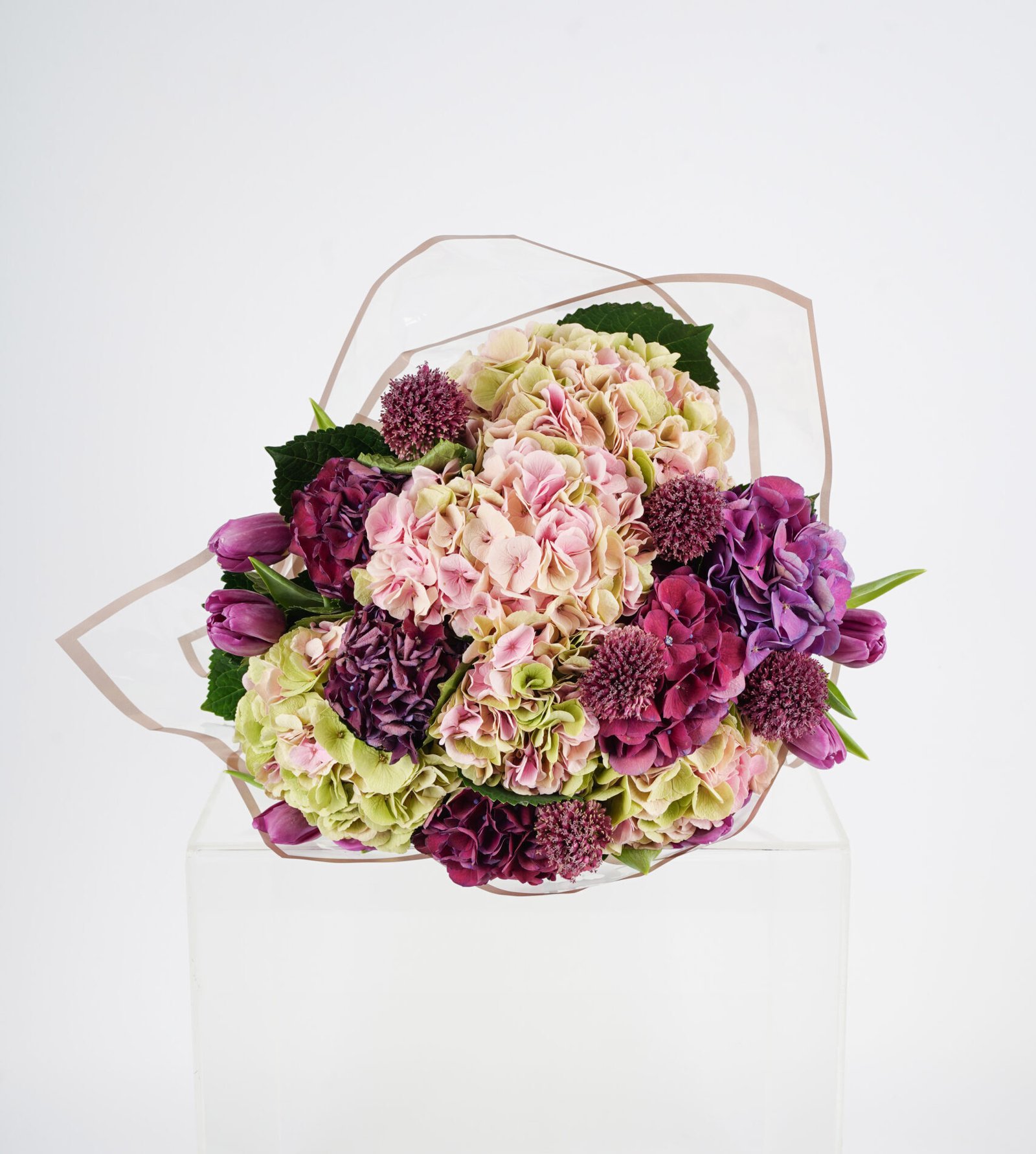 A lush bouquet of hydrangea, tulips, and seasonal blooms, wrapped delicately for a romantic and elegant finish.