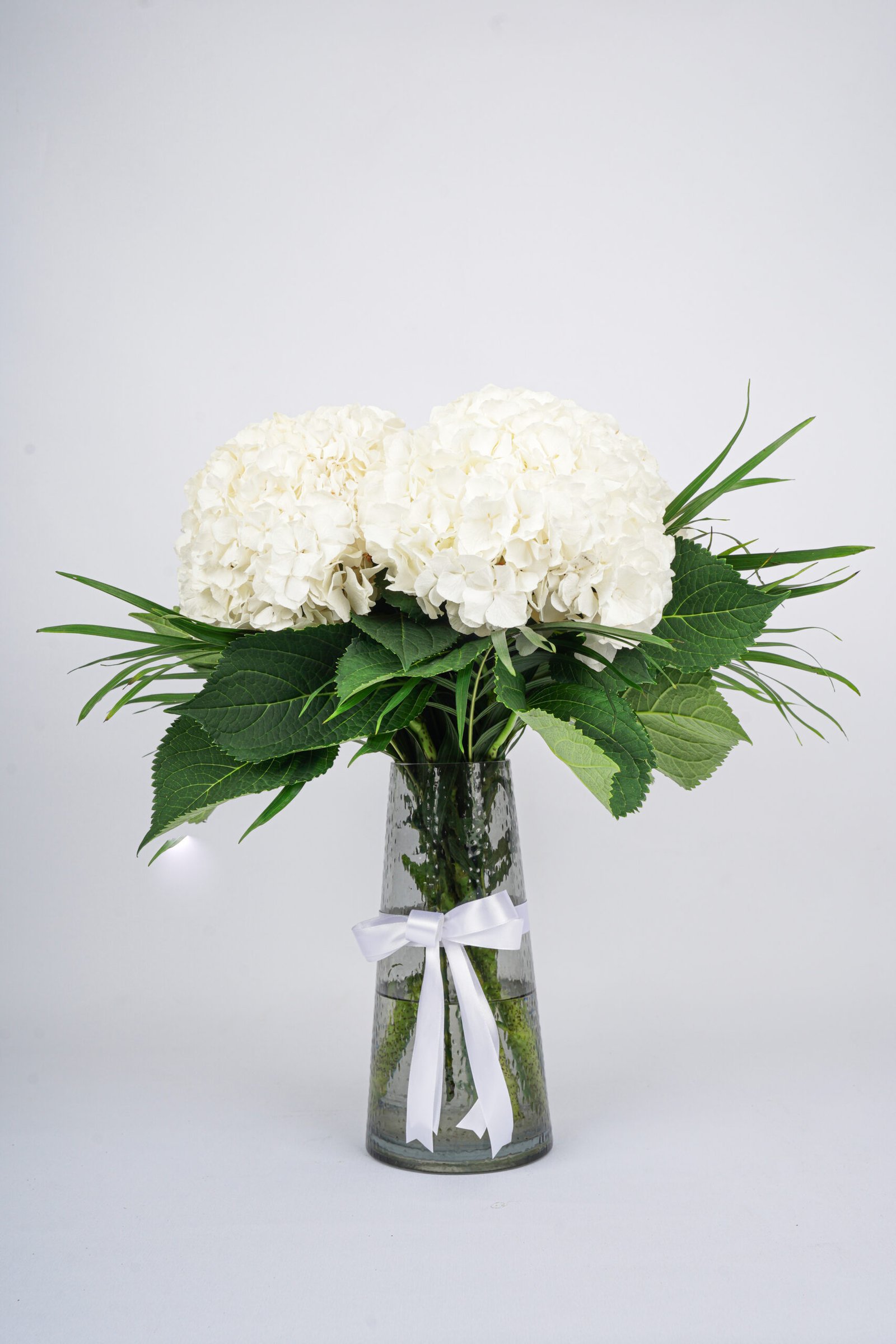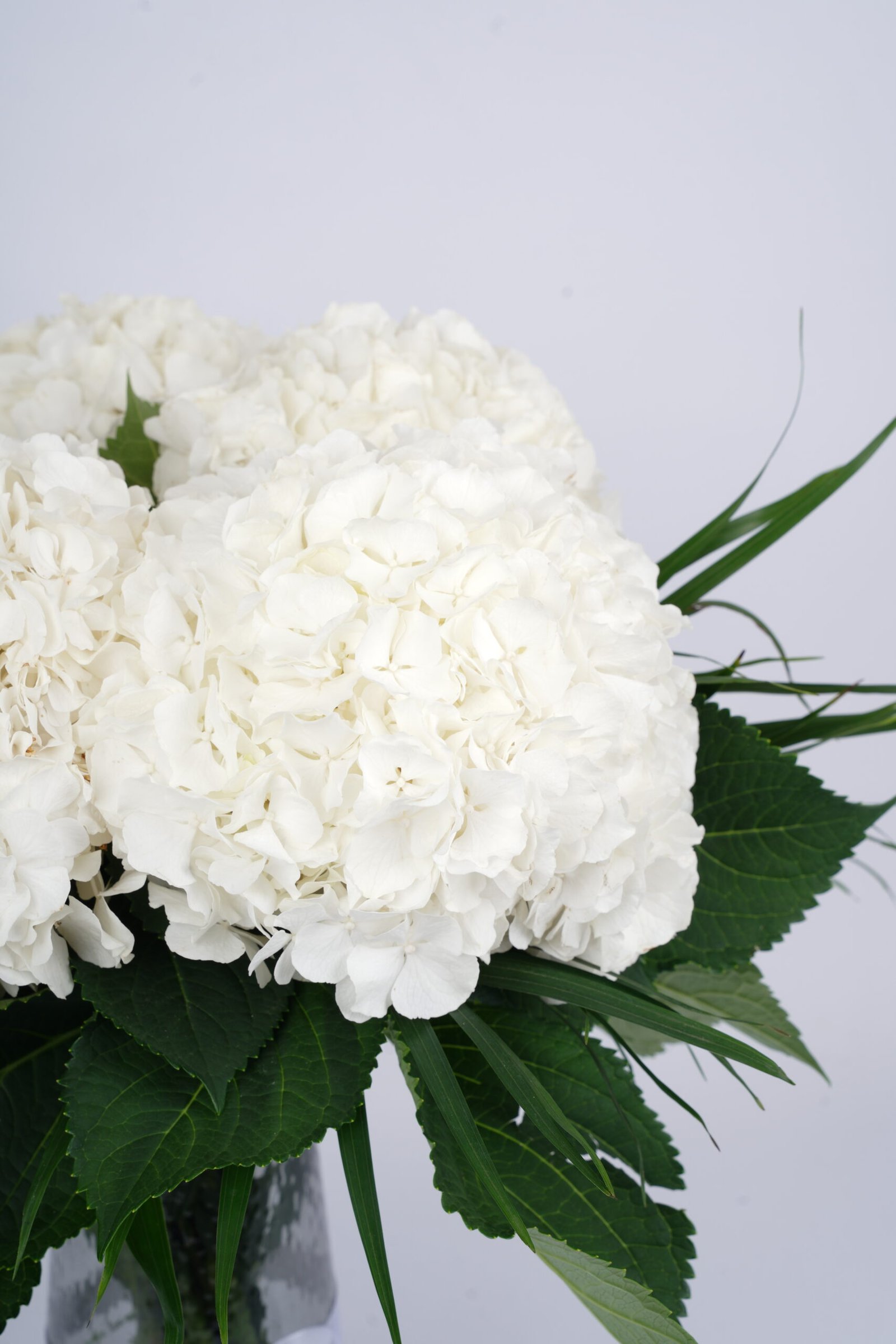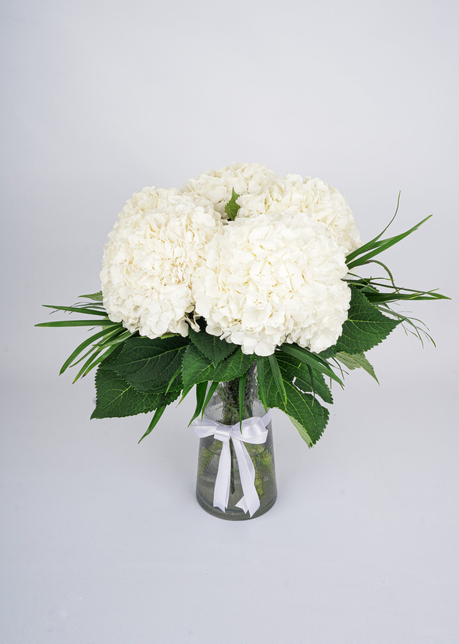 A classic arrangement of pure white hydrangeas elegantly displayed in a clear glass vase with fresh green foliage