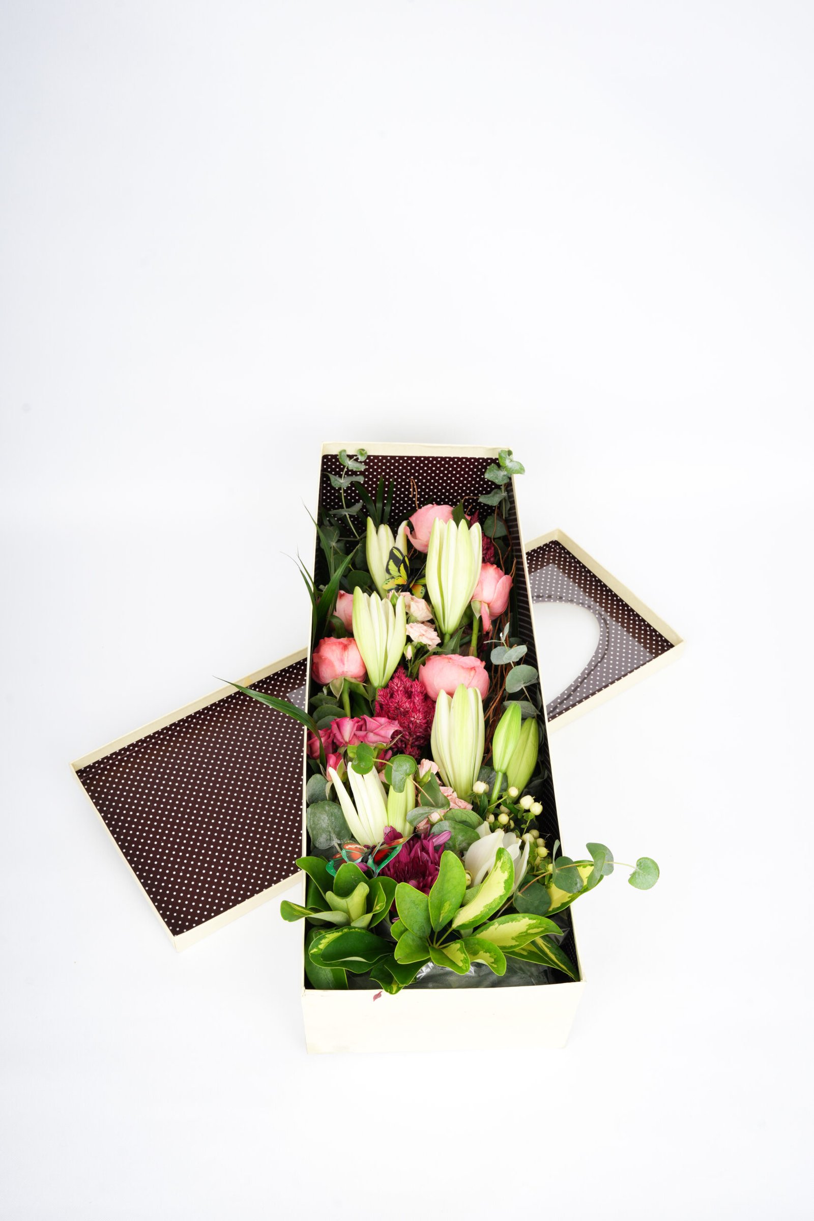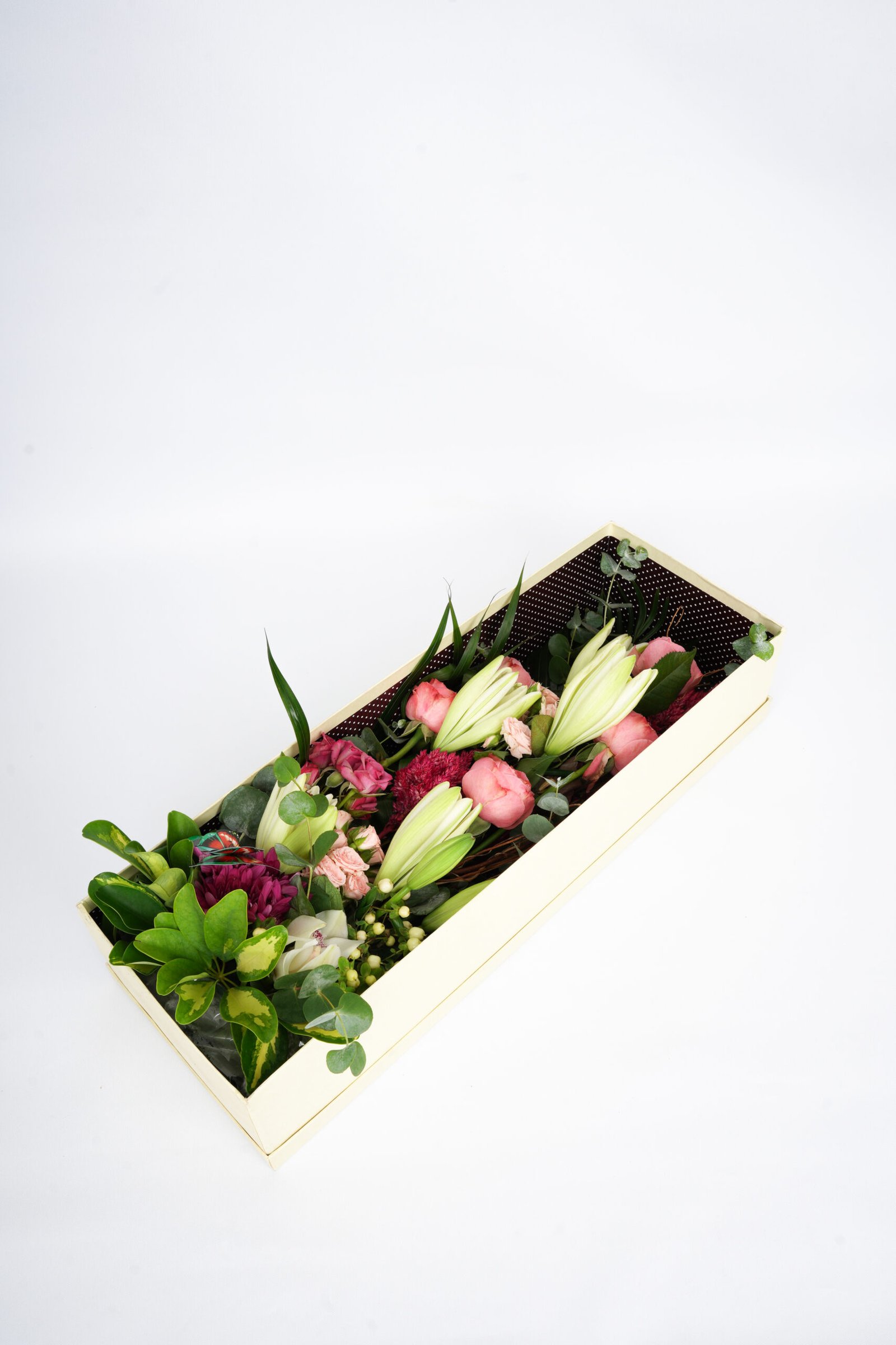 An artistic floral box arrangement with lily buds, pink roses, seasonal blooms, and lush foliage—modern and statement-making.