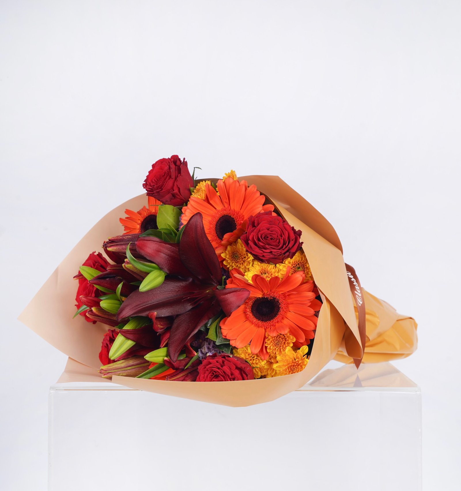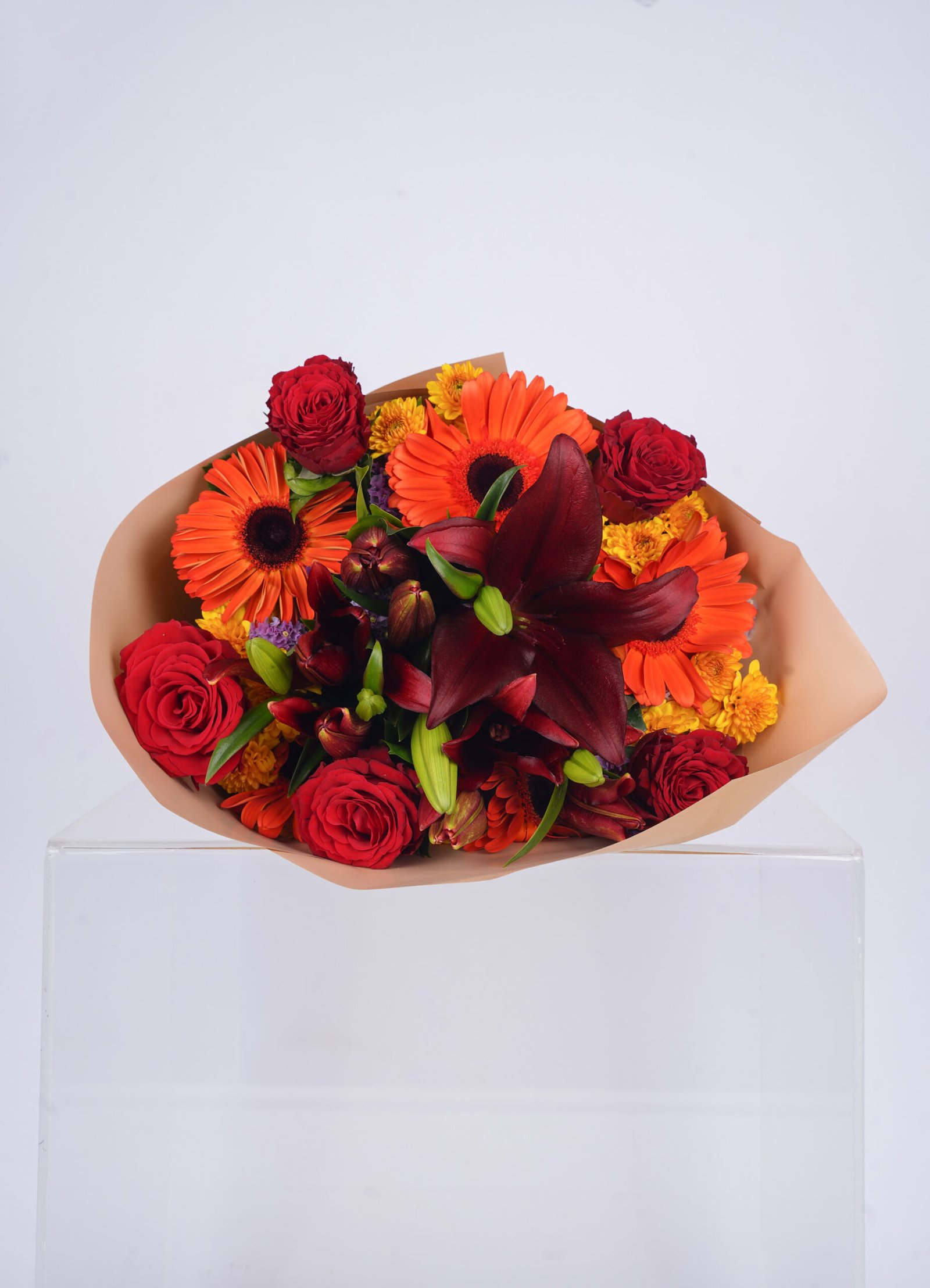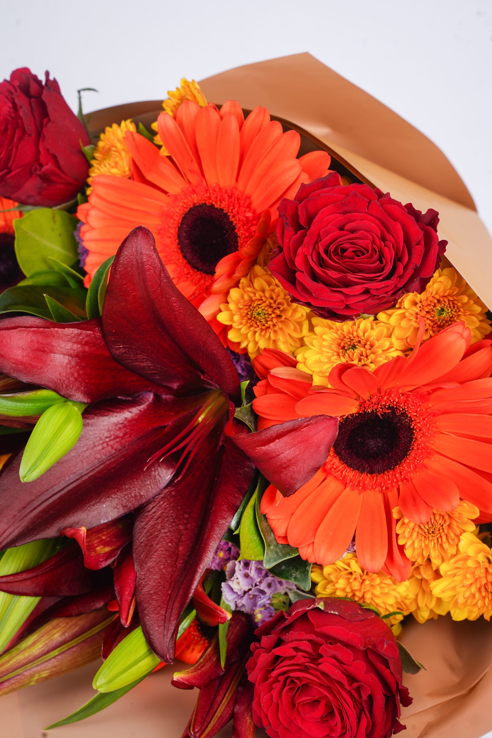 A warm-toned bouquet of roses and gerbera in rich red and orange shades for a bold statement