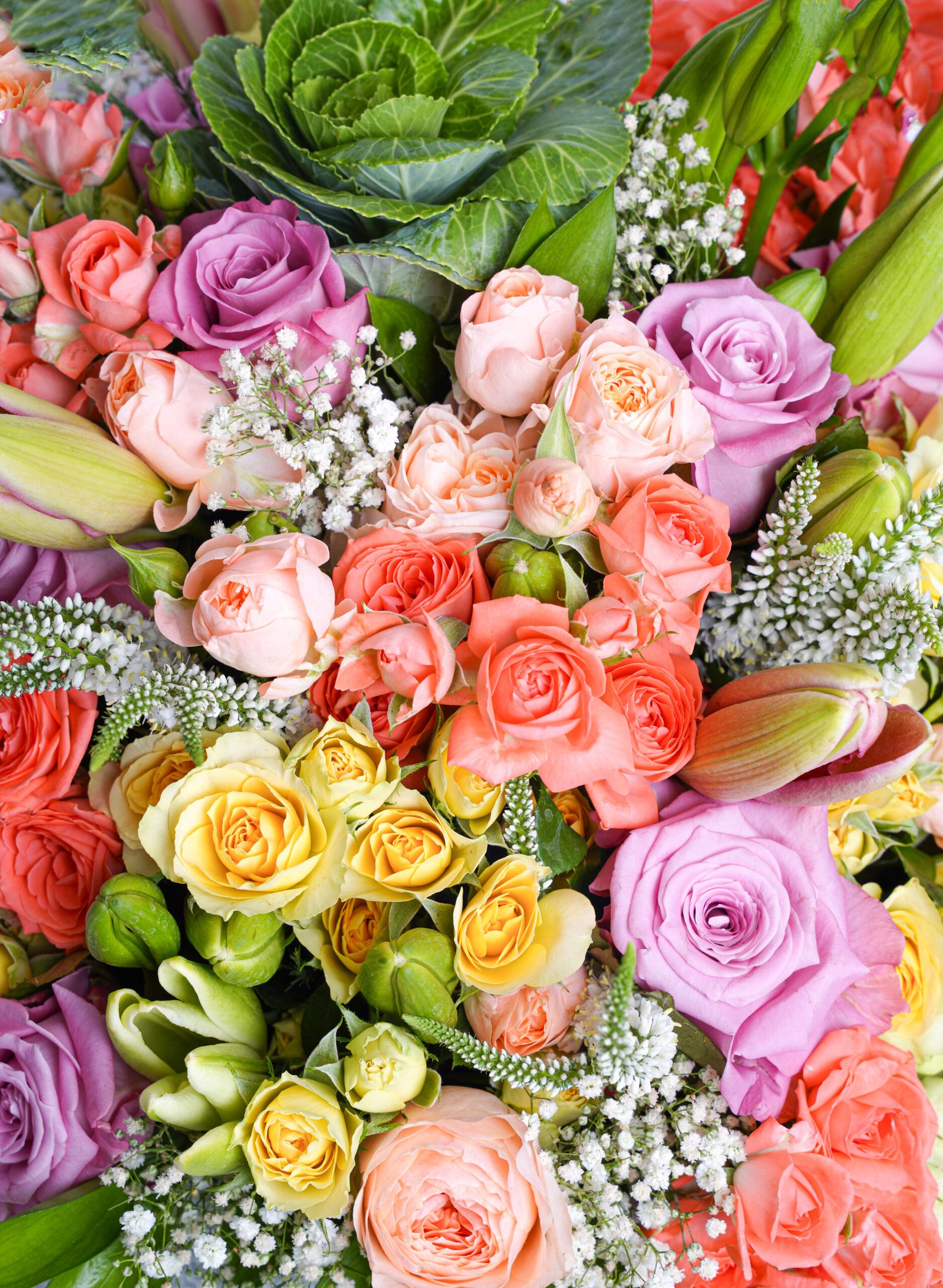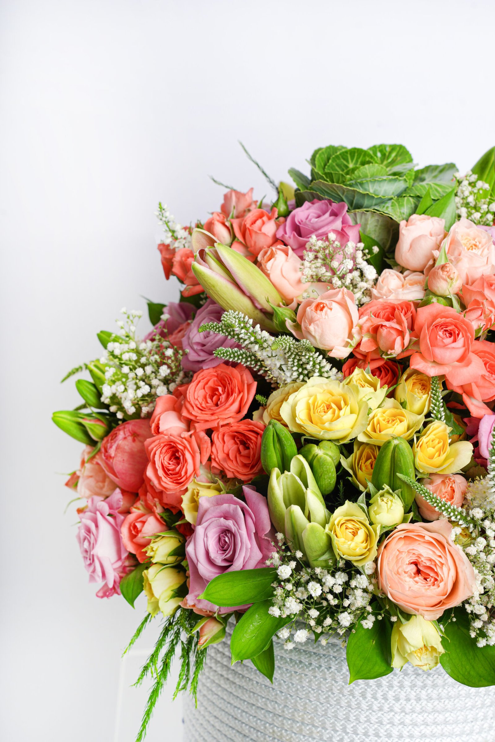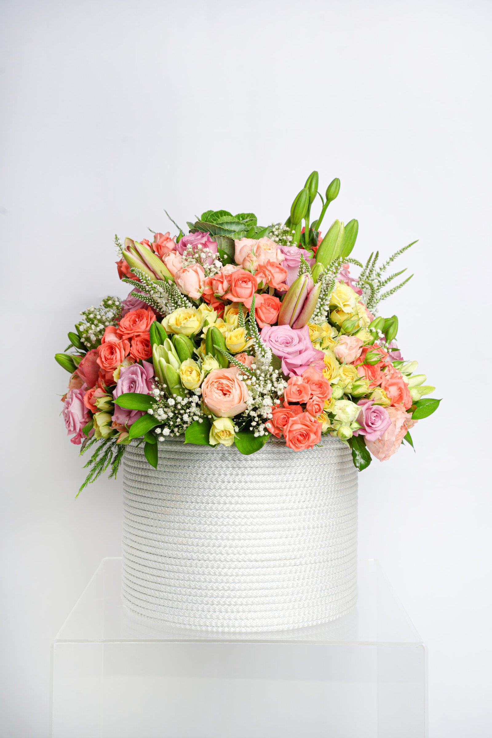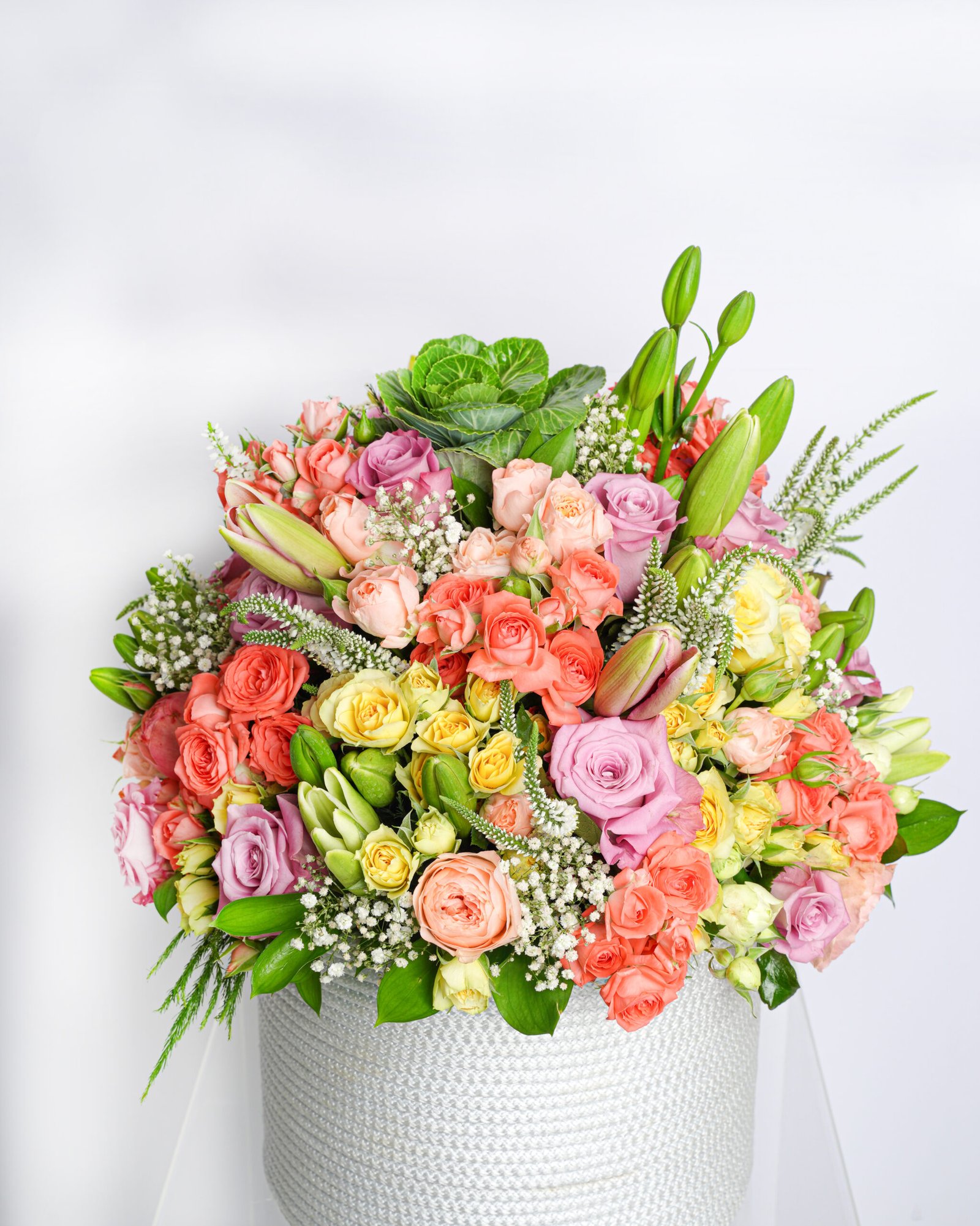 A vibrant floral arrangement featuring peach, pink, and yellow roses, spray roses, lily buds, veronica, baby’s breath, and lush greenery, beautifully arranged in a textured decorative handmade bag