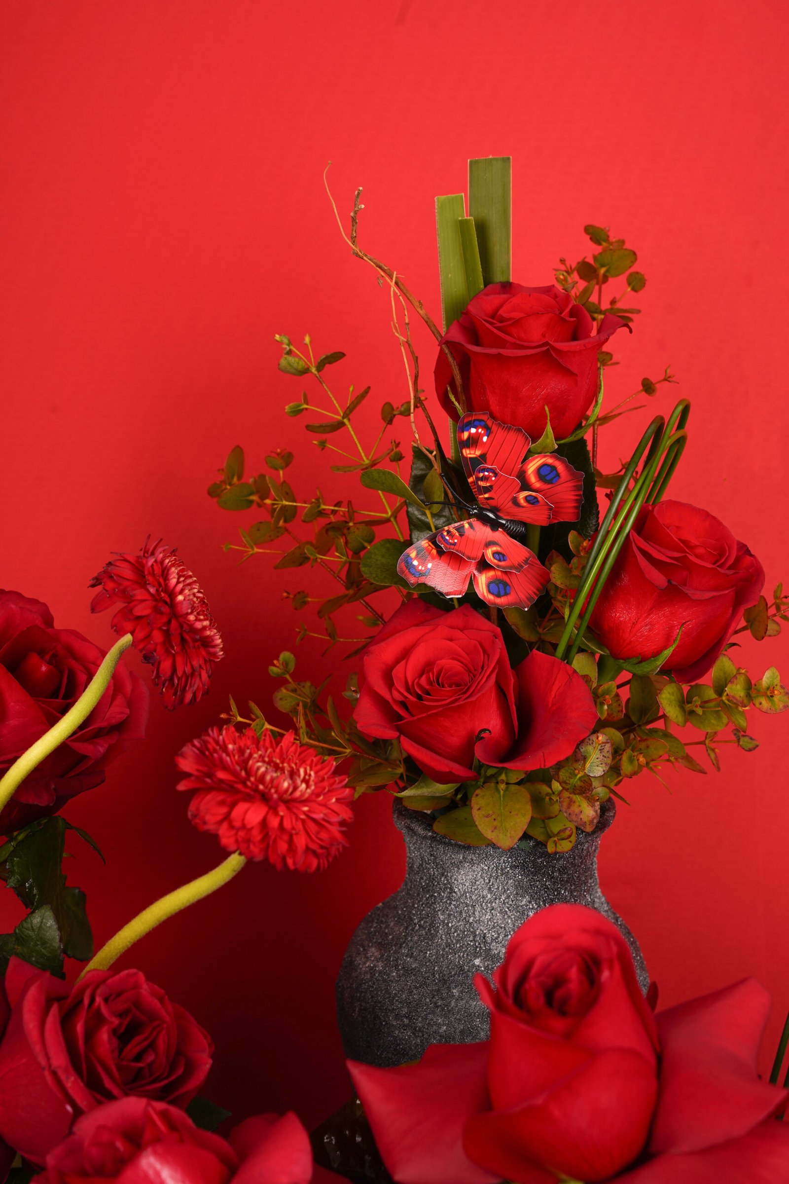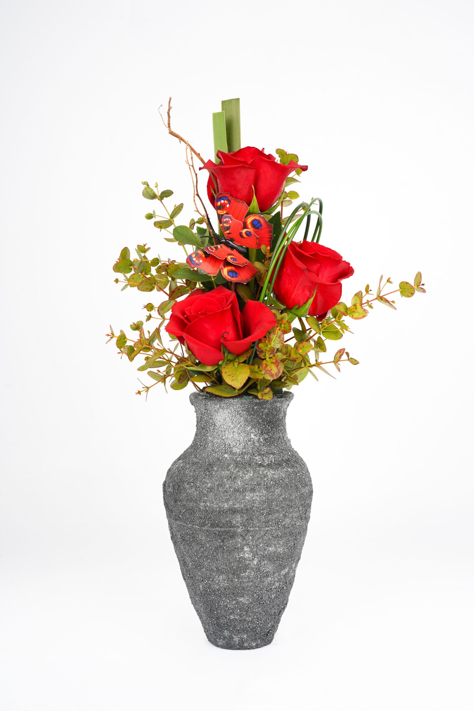 A refined arrangement of red roses accented with natural greenery and artistic details, elegantly displayed in a textured stone vase. A timeless piece that speaks of passion, elegance, and quiet luxury