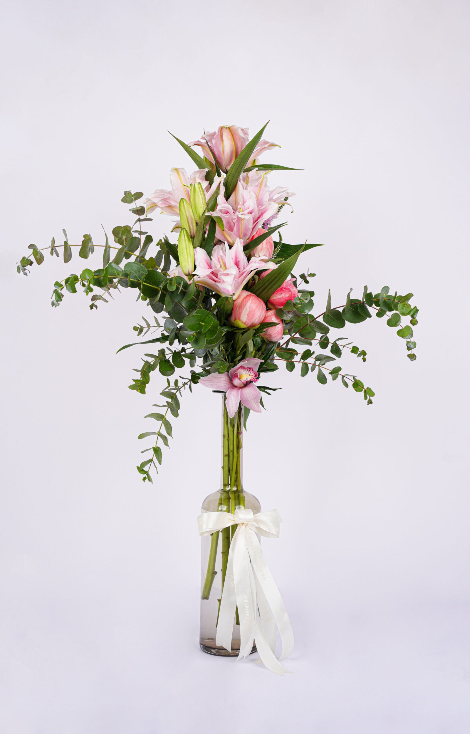 A graceful tall arrangement featuring pink lilies, tulips, and a delicate orchid bloom, accented with flowing eucalyptus greenery and presented in a clear glass vase. Elegant and modern