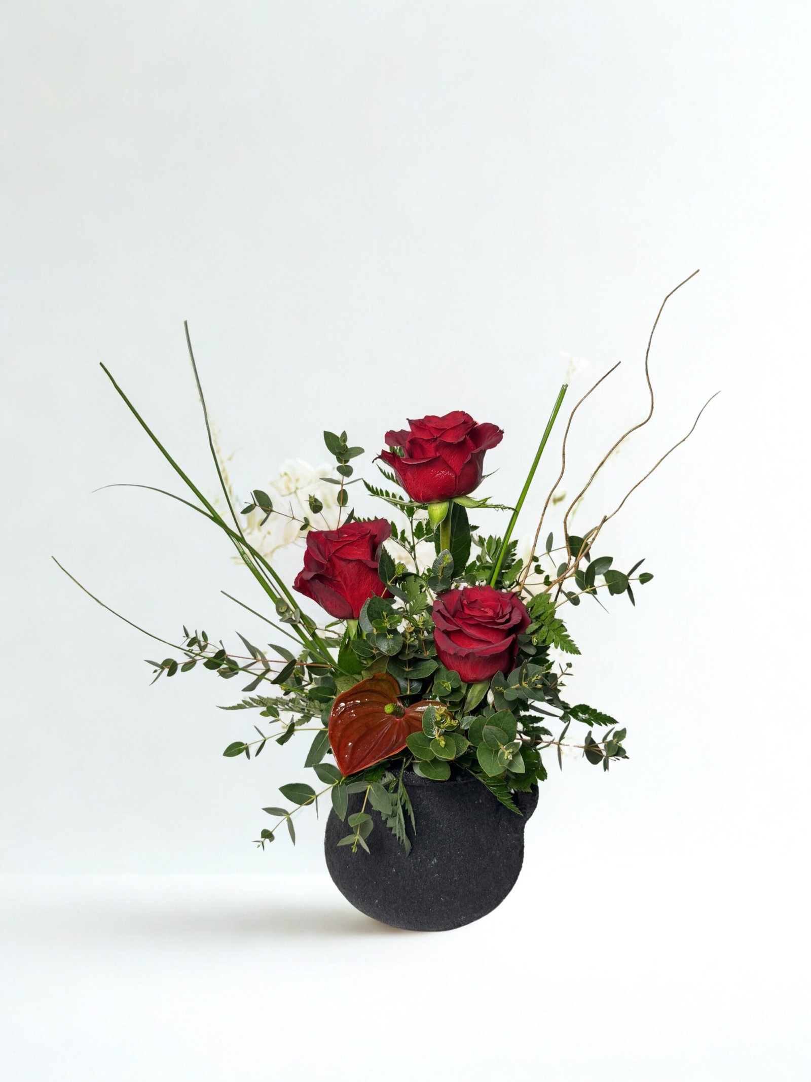 A refined arrangement of three deep red roses styled with lush greenery and artistic branches in a modern black vase. Bold yet minimal